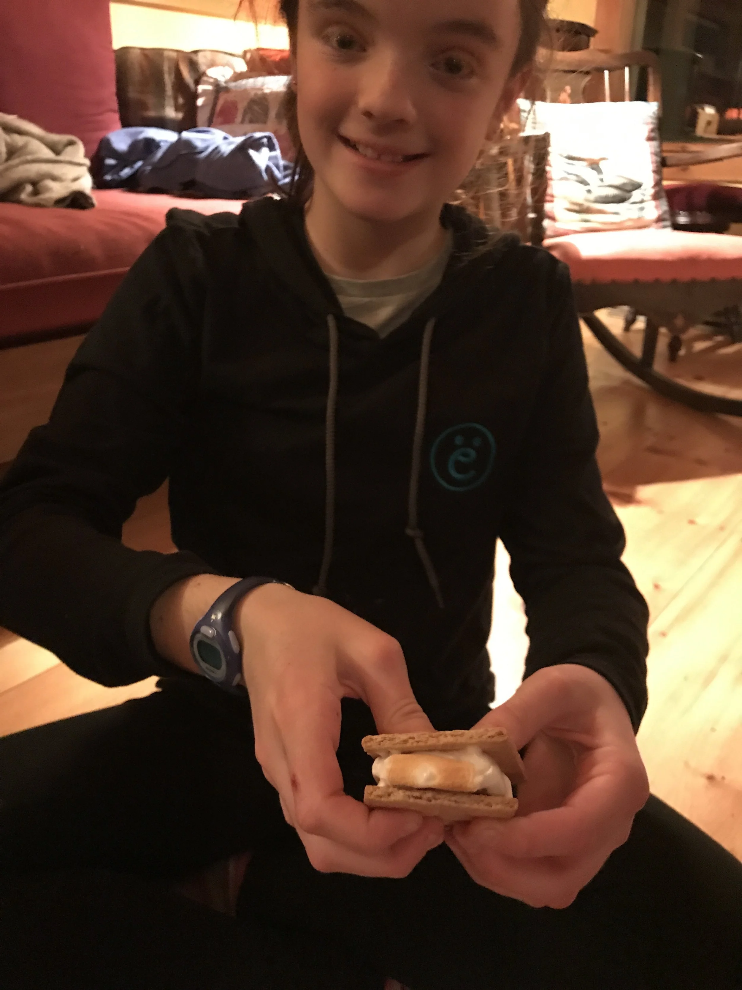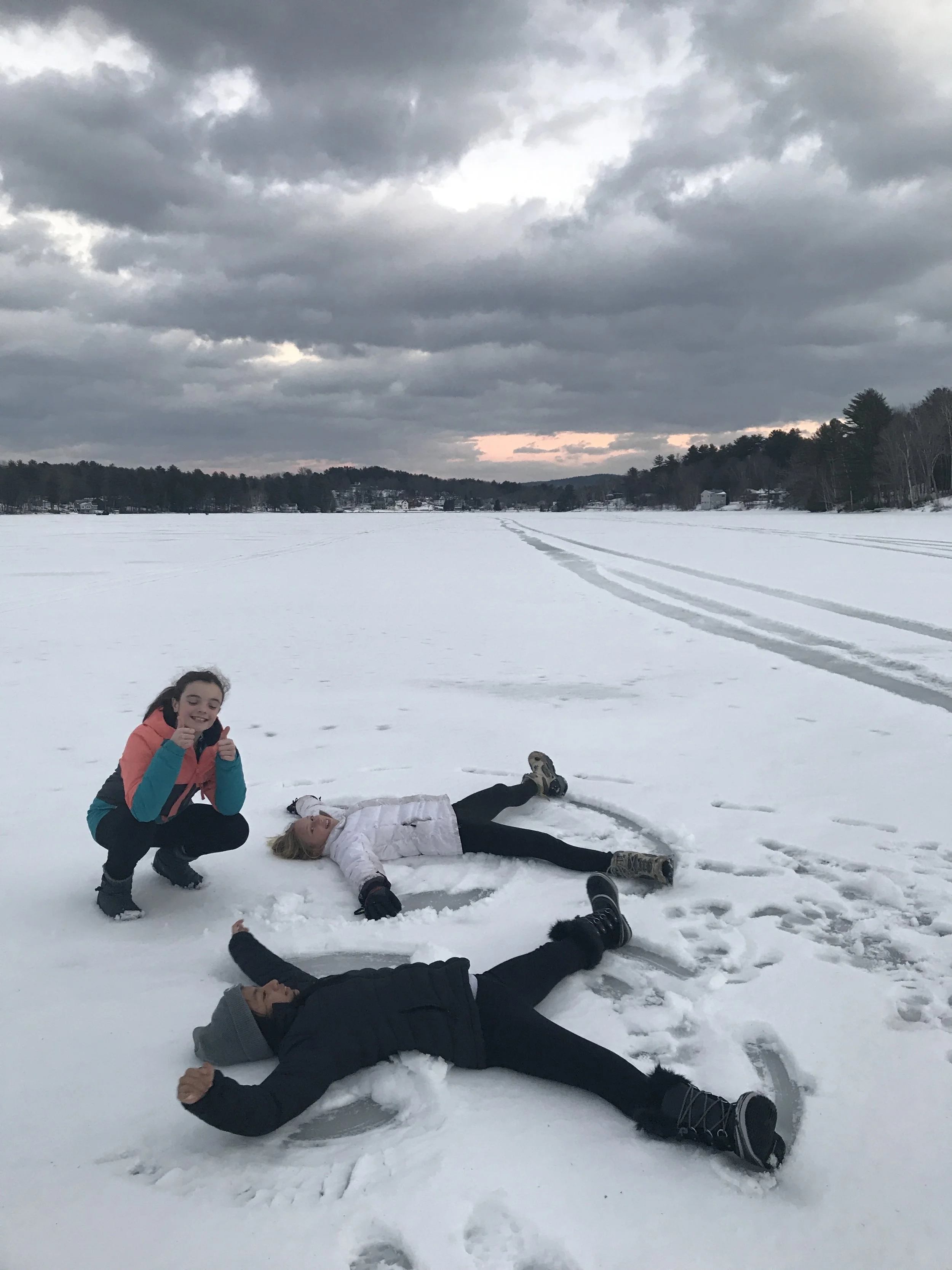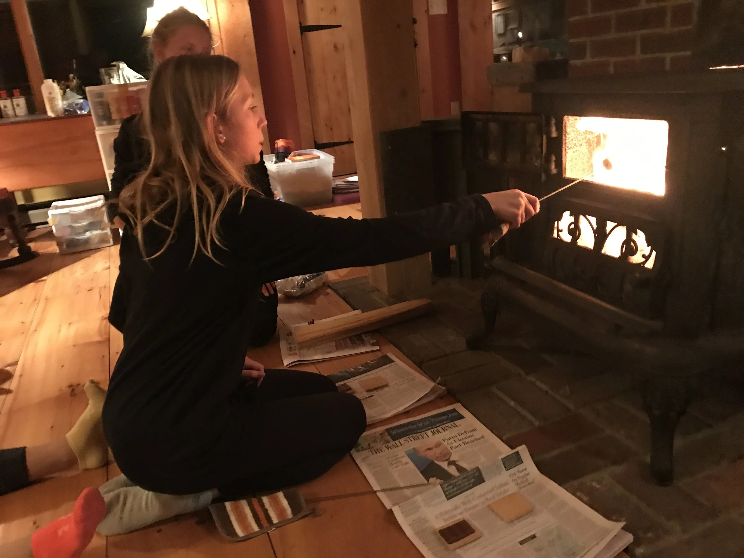 We packed so much into one weekend...the girls arrived after school on Friday and had warm banana bread waiting for them. We packed up the car and drove to Wilton. Each of the girls got a Camp Chloë hoodie to stay warm during the weekend! Once we arrived at the house, the girls got setteled and played some games by the fire while we made dinner for them. After dinner we roasted marshmellows in the wood stove and made s'mores. We then went ouside (it was a beautiful night!) and walked out on the frozen lake. There were a couple inches of fresh snow over the ice and although it was not yet the right consistency for making snowmen, we had hope that tomorrow would be better...